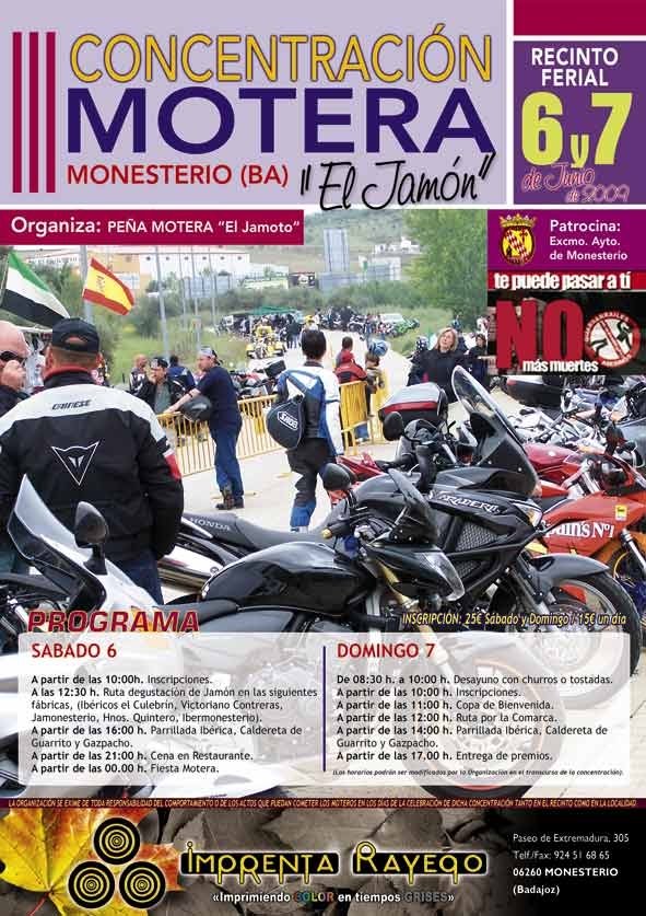 bueno me es un honor poder presentar la 3ª concentracion de motos que organiza el moto-club jamoto de monesterio (badajoz), situado en la via de la plata a unos 100 kms de sevilla y a otros tantos de merida y badajoz. enclave ideal para disfrutar de todos los derivados del cerdo iberico y los paladares de la cocina extremeña.